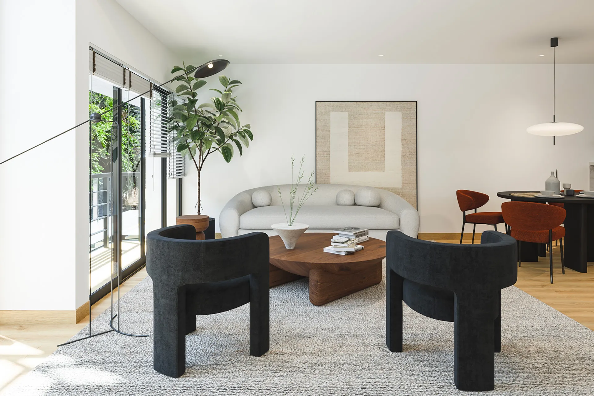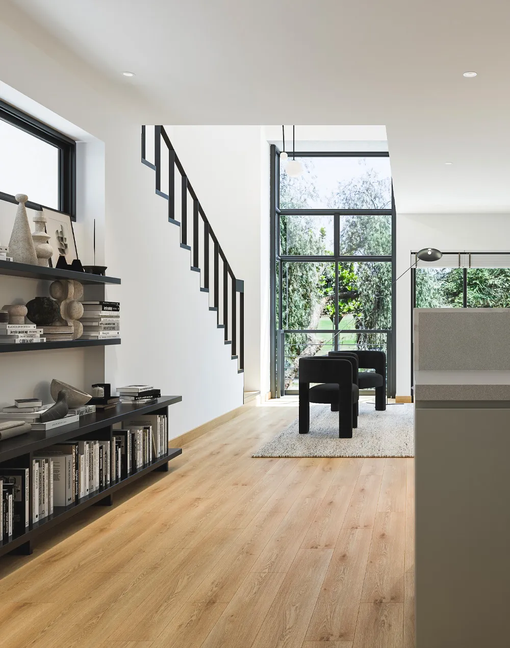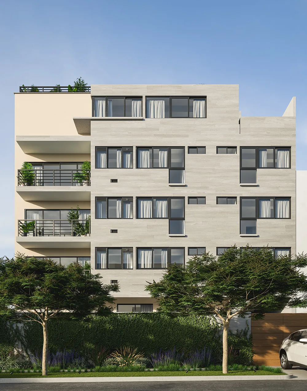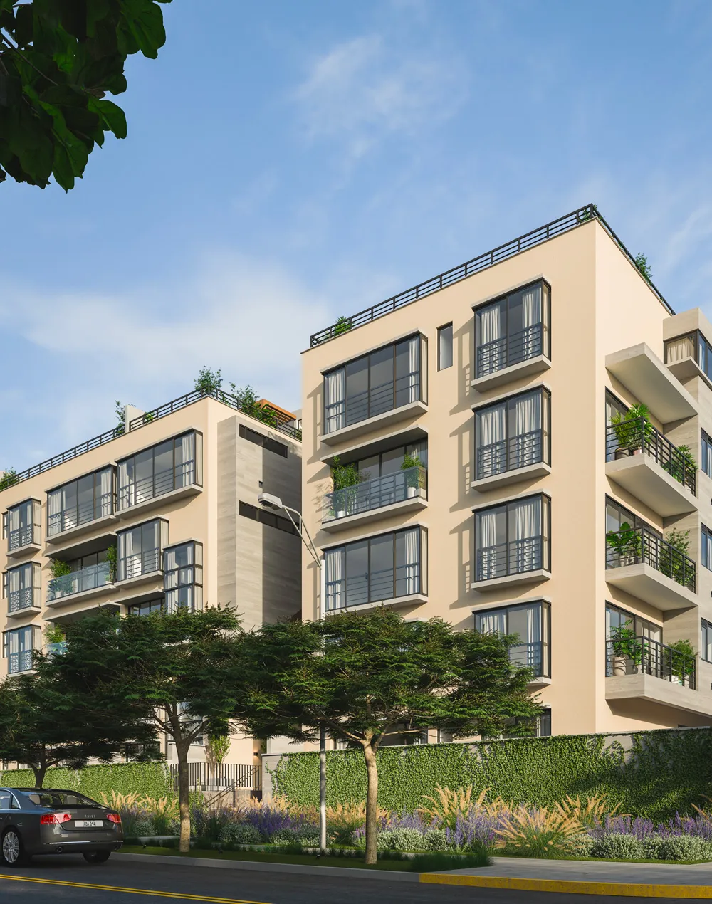 La fachada principal, sobre la avenida Lima Polo, se caracteriza por elementos acristalados de piso a techo y los balcones que corresponden a las sala-comedor. Las habitaciones principales también tienen vista a los maravillosos espacios verdes. Sobre la fachada lateral, en la calle Pio XII, se ubican los ambientes secundarios. Estos tienen ventanas mampara tipo balcón y balcones en los departamentos en esquina.